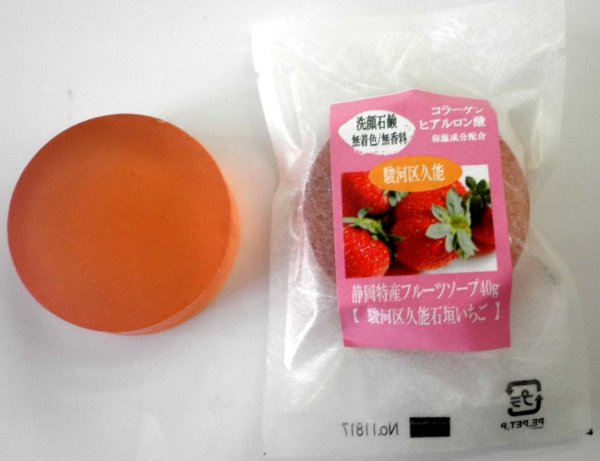 静岡特産品の駿河区久能の石垣イチゴの果汁・果肉を保湿効果に優れた透明石鹸素地に配合した無着色、無香料のフルーツの洗顔石鹸です。話題のコラーゲン、ヒアルロン酸も追加配合して、洗顔後の潤いもキープします